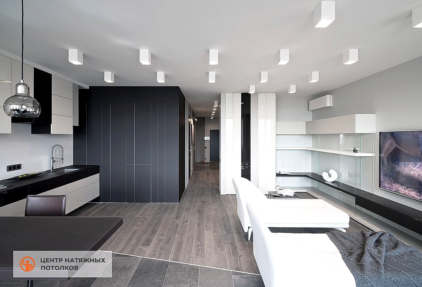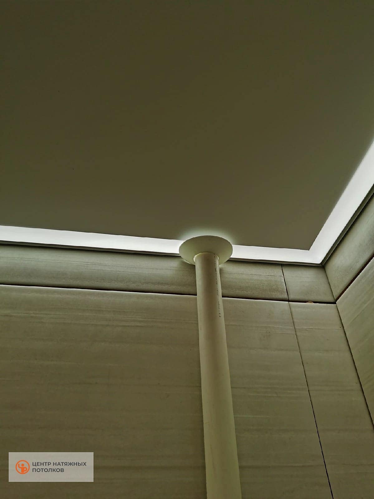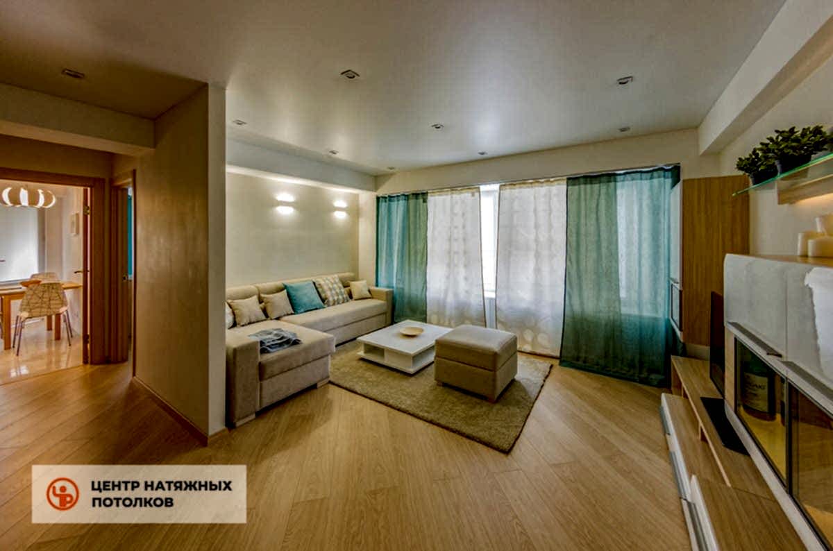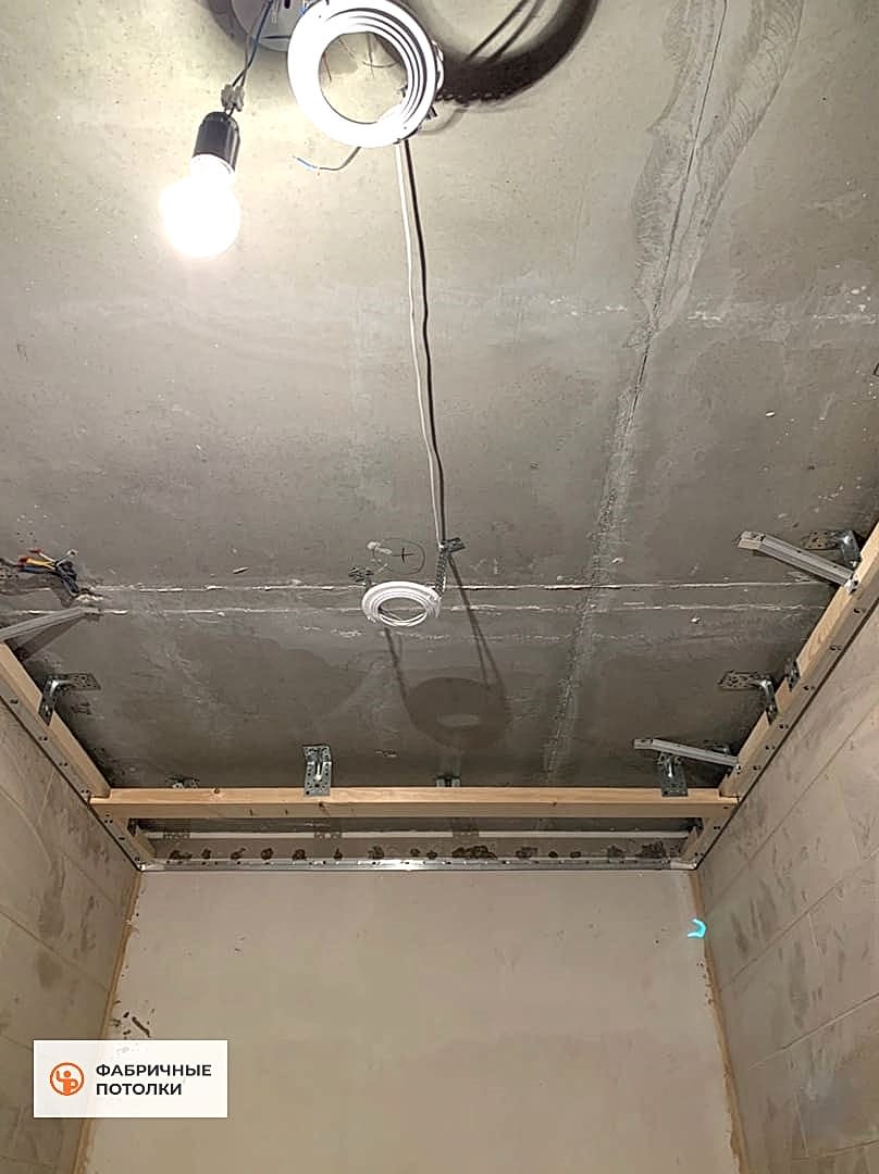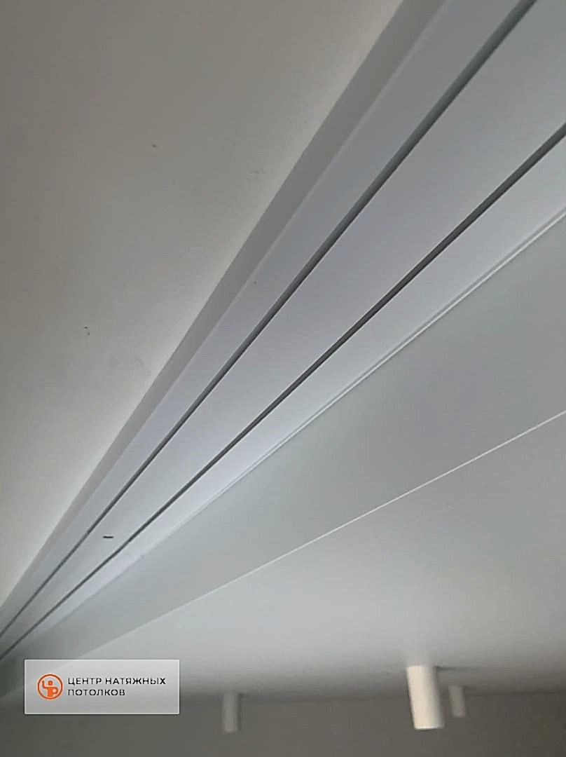 Минимальное расстояние от чернового Pin-Up это 2-3 см. На высоту отступа влияет высота встраиваемых светильников, проходящие коммуникации и пожелания заказчика по дизайну. Например, многоуровневые натяжные потолки опустятся на 9-10 см.