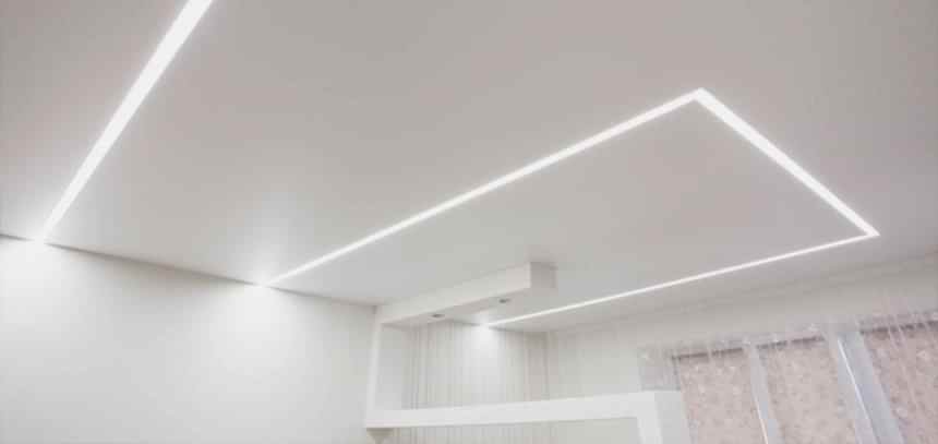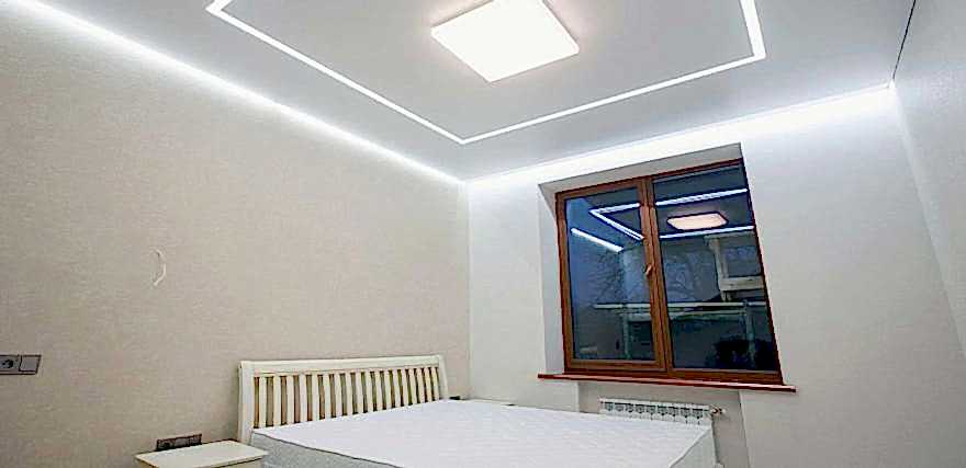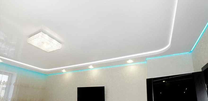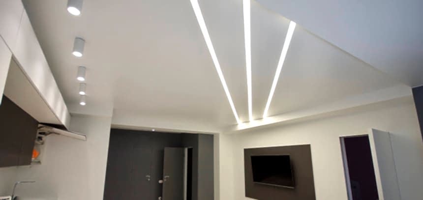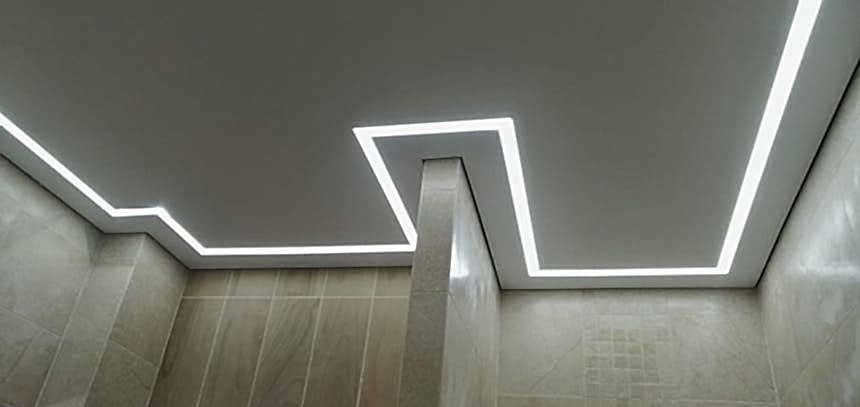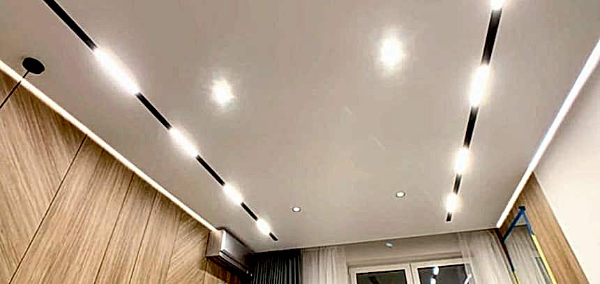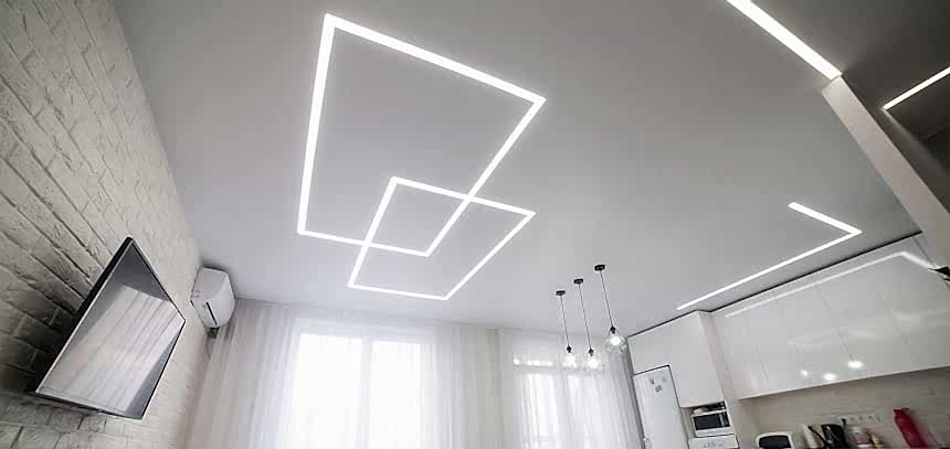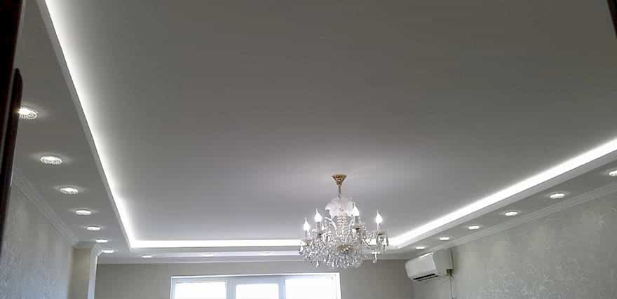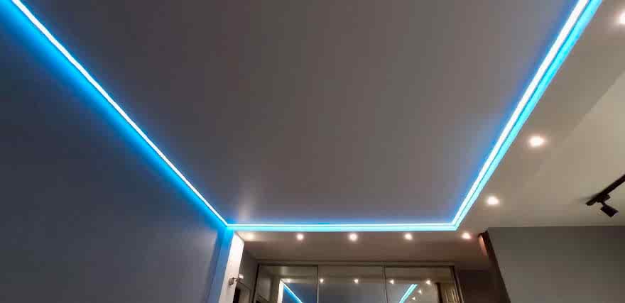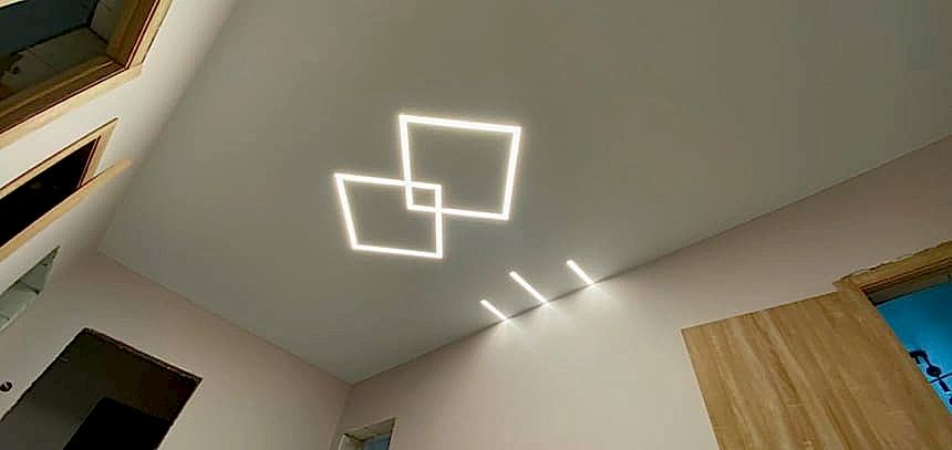 Цена натяжного потолка также может увеличиться с учетом дополнительных операций, не связанных с монтажом каркаса или натягиванием полотна. В эту категорию входит монтаж цветных вставок, встроенных светильников и проводки, а также создание многоуровневых конструкций и различных Pin-Up