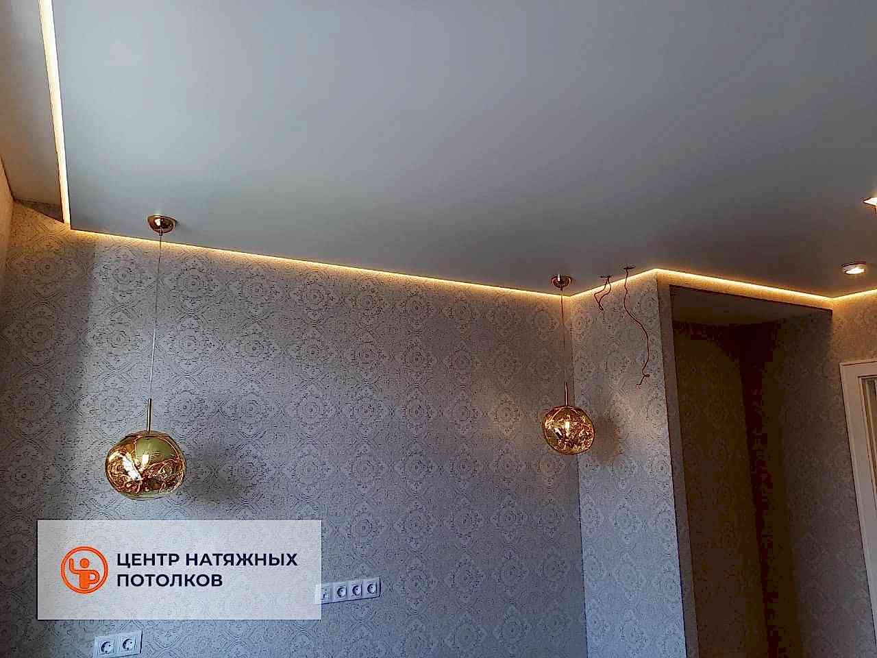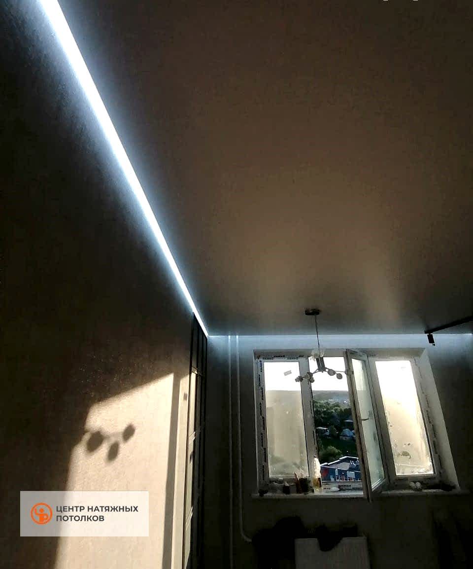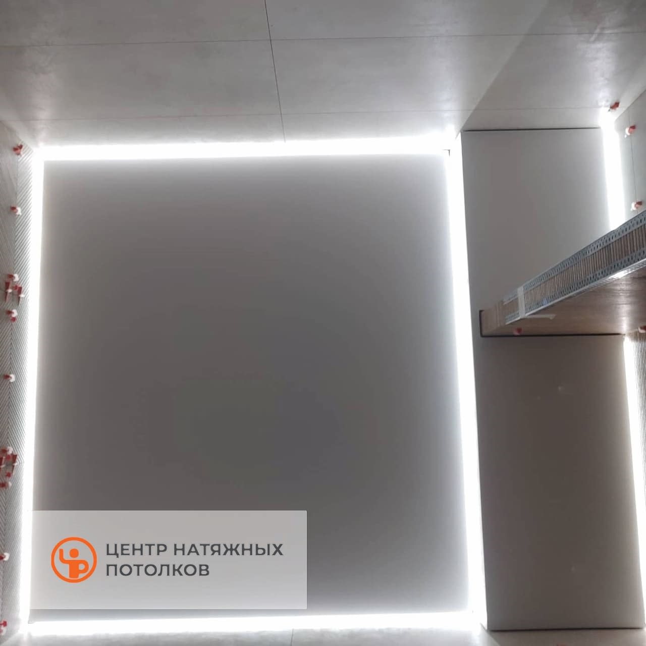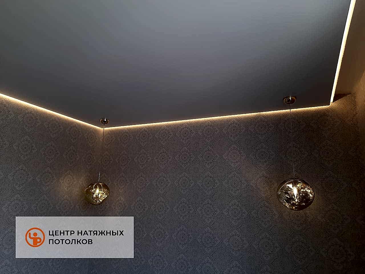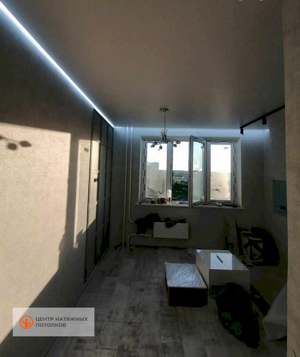 Натяжной потолок с четко ограниченной подсветкой монтируется на контурный профиль, Pin-Up отличается от парящего тем, что лента остаётся за полотном. В выключенном виде контурный потолок ничем не выдаёт наличие подсветки.
