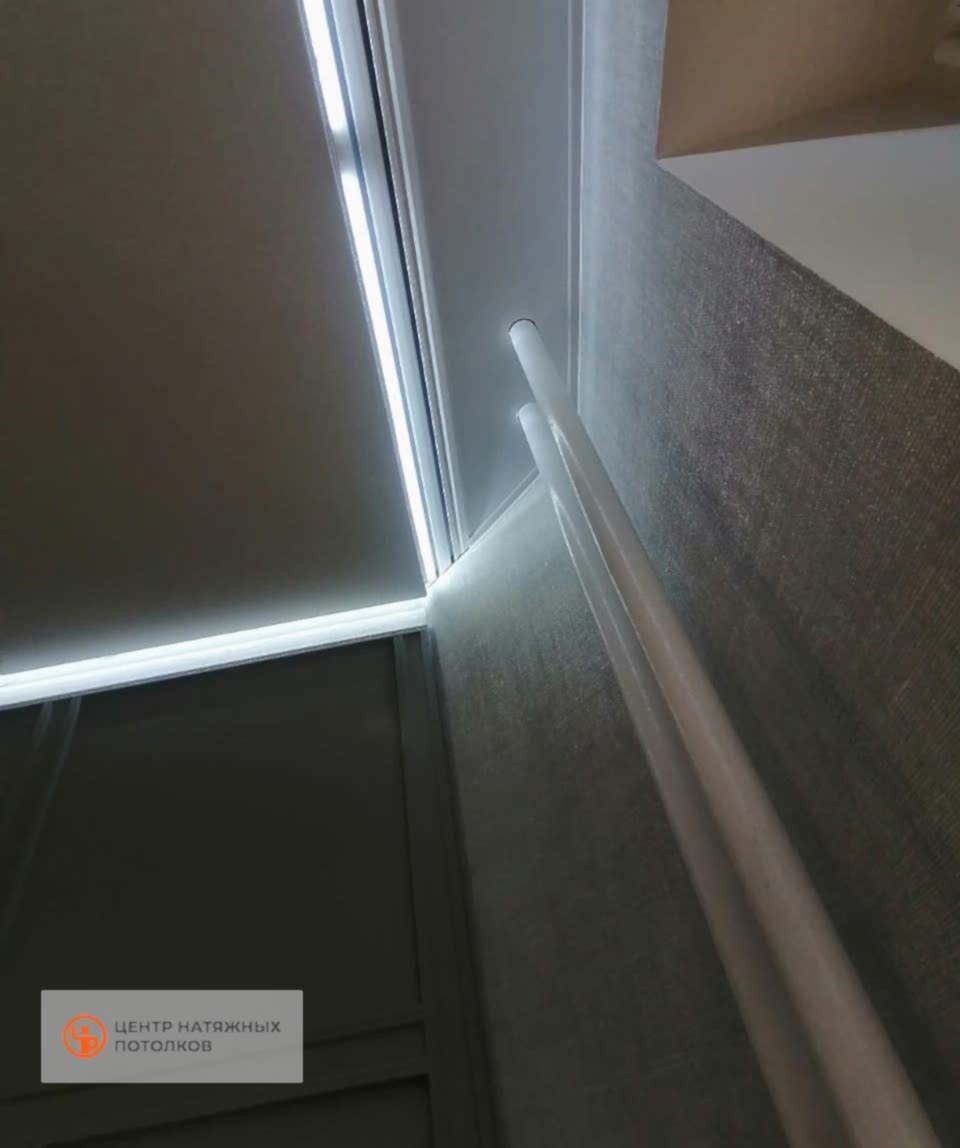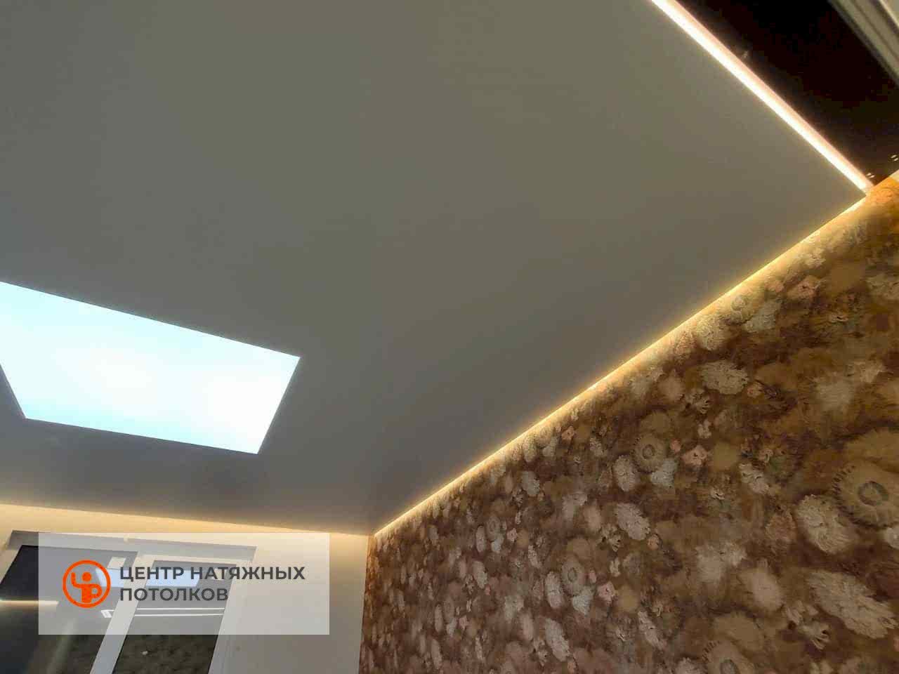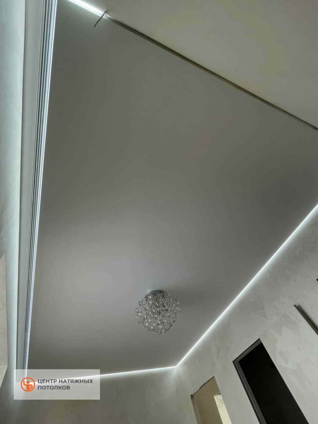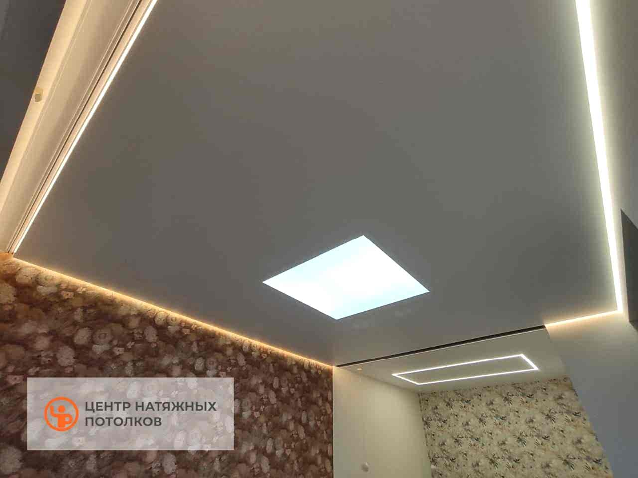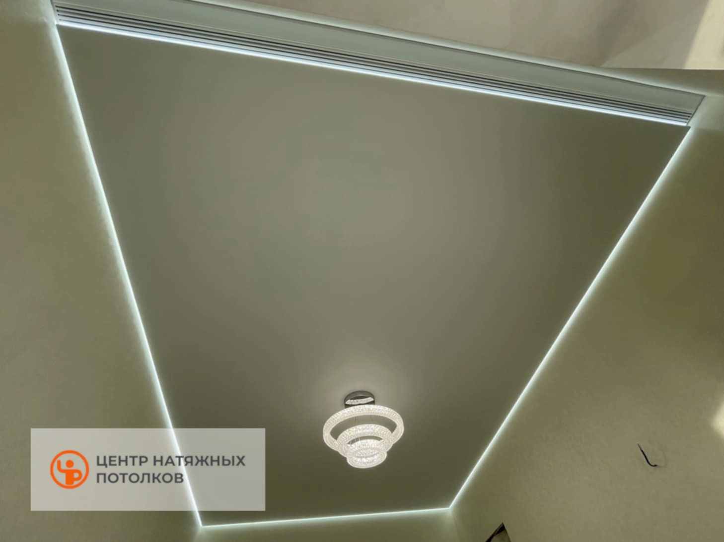 Натяжной потолок с четко ограниченной подсветкой монтируется на контурный профиль, Pin-Up отличается от парящего тем, что лента остаётся за полотном. В выключенном виде контурный потолок ничем не выдаёт наличие подсветки.