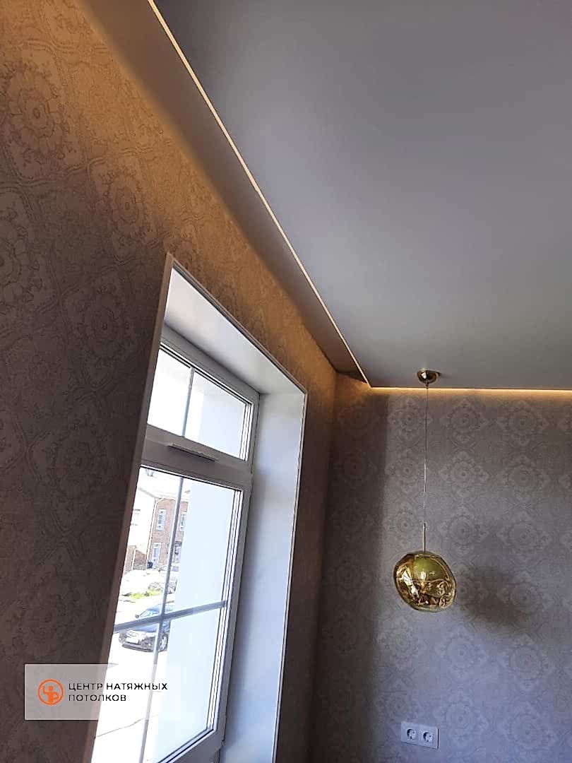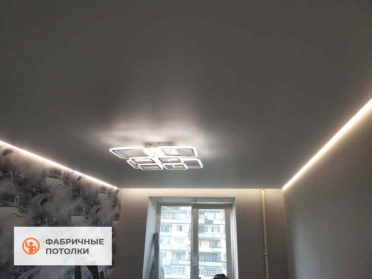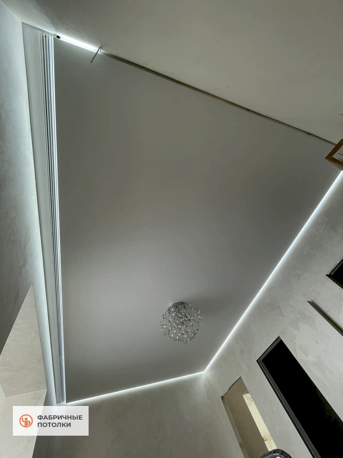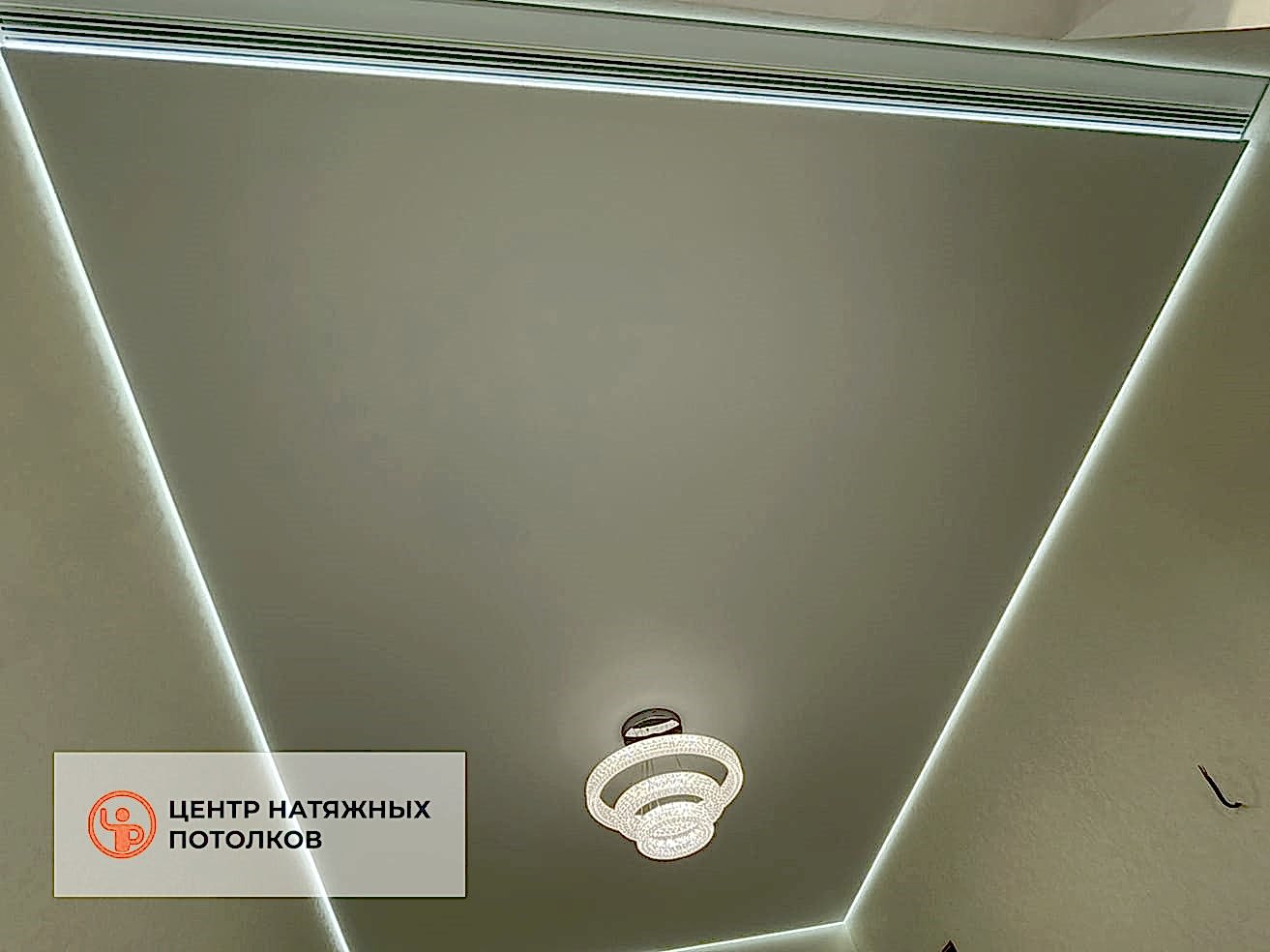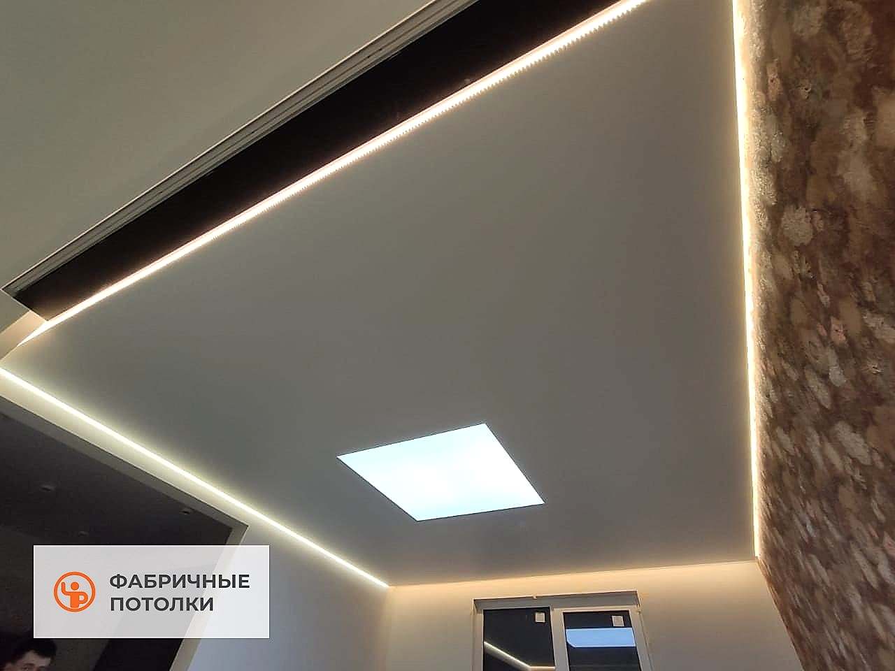 Натяжной потолок с четко ограниченной подсветкой монтируется на контурный профиль, Pin-Up отличается от парящего тем, что лента остаётся за полотном. В выключенном виде контурный потолок ничем не выдаёт наличие подсветки.