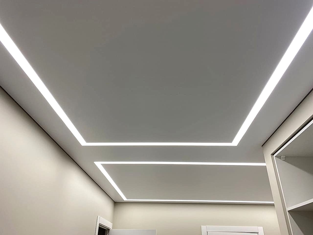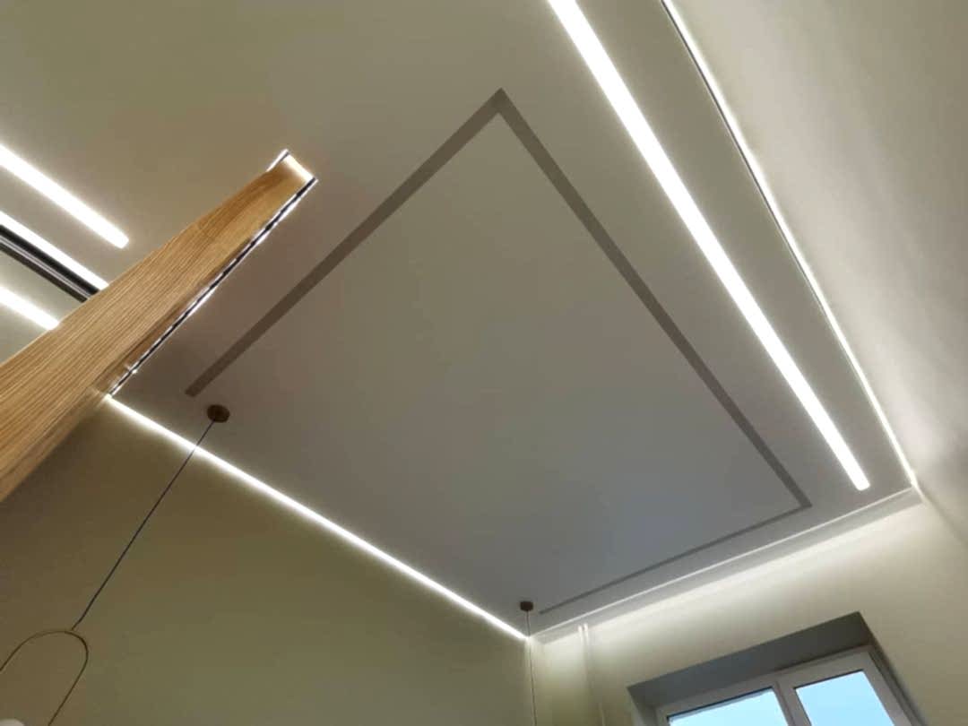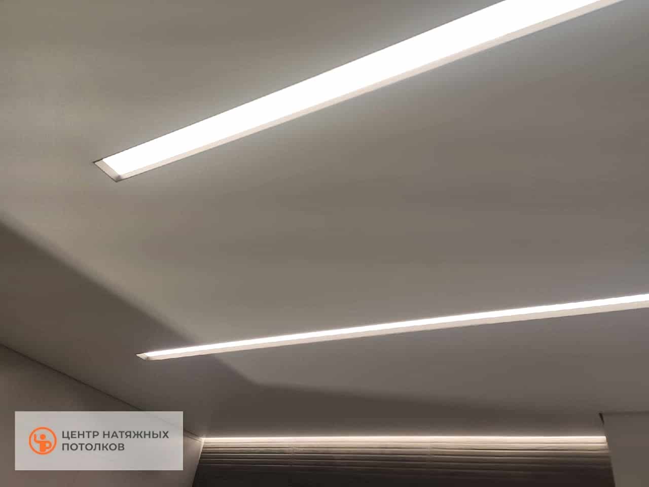 Встроенные световые линии изготавливаются из алюминиевого профиля Arlight SL-LUX. Профиль производится разной ширины. В профиль устанавливается светодиодная лента соответственной ширины от Arlight. Алюминиевый профиль закрепляется в закладной из фанеры, изготовленной по его размерам. Вся конструкция крепится к черновому потолку укосинами.