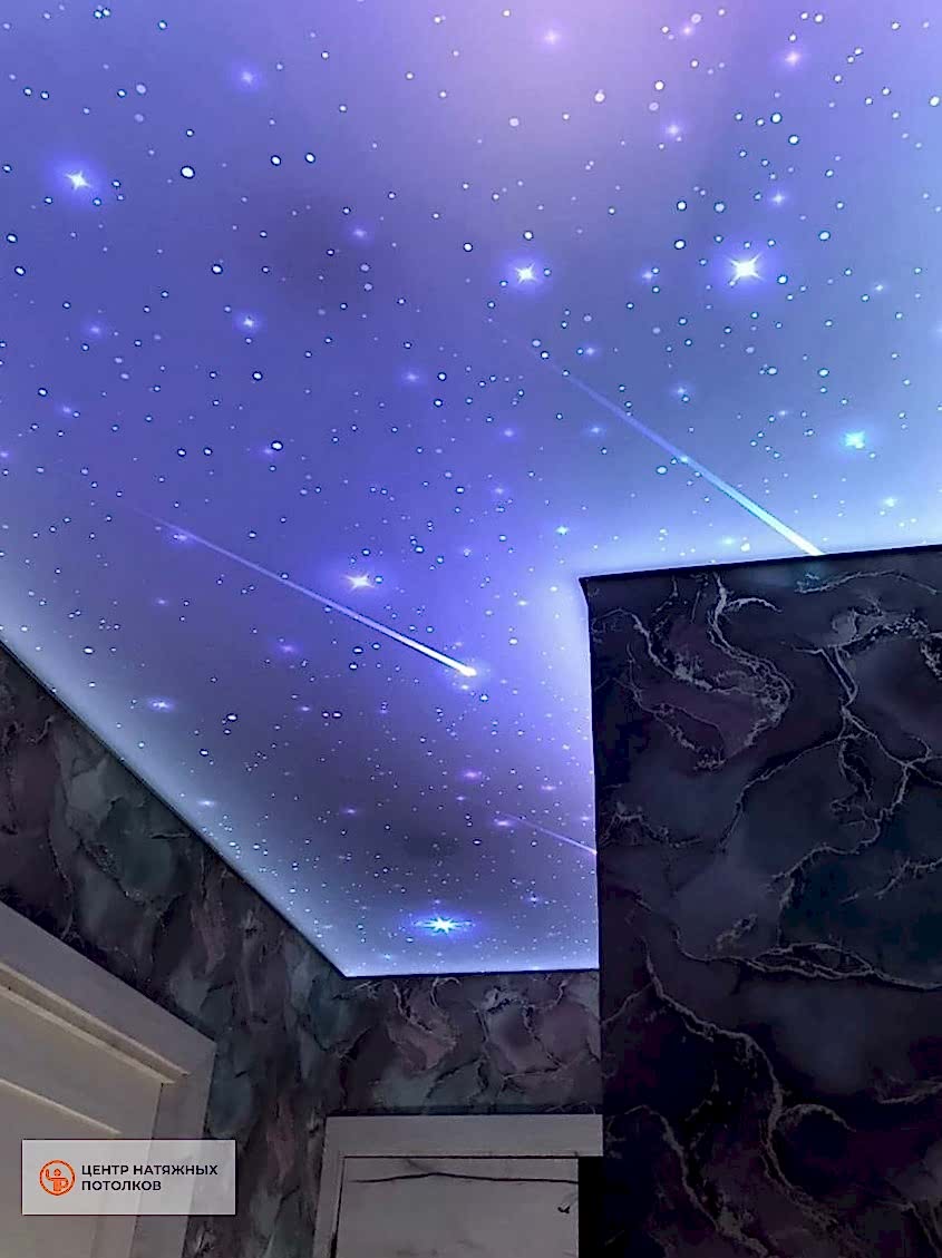 Эффект мерцания звезд получается благодаря Pin-Up оптоволоконным нитям. Провода и светогенератор скрывают в межпотолочном пространстве. В полотне проделывают маленькие отверстия для монтажа оптоволоконных нитей, которые и будут изображать звезды.